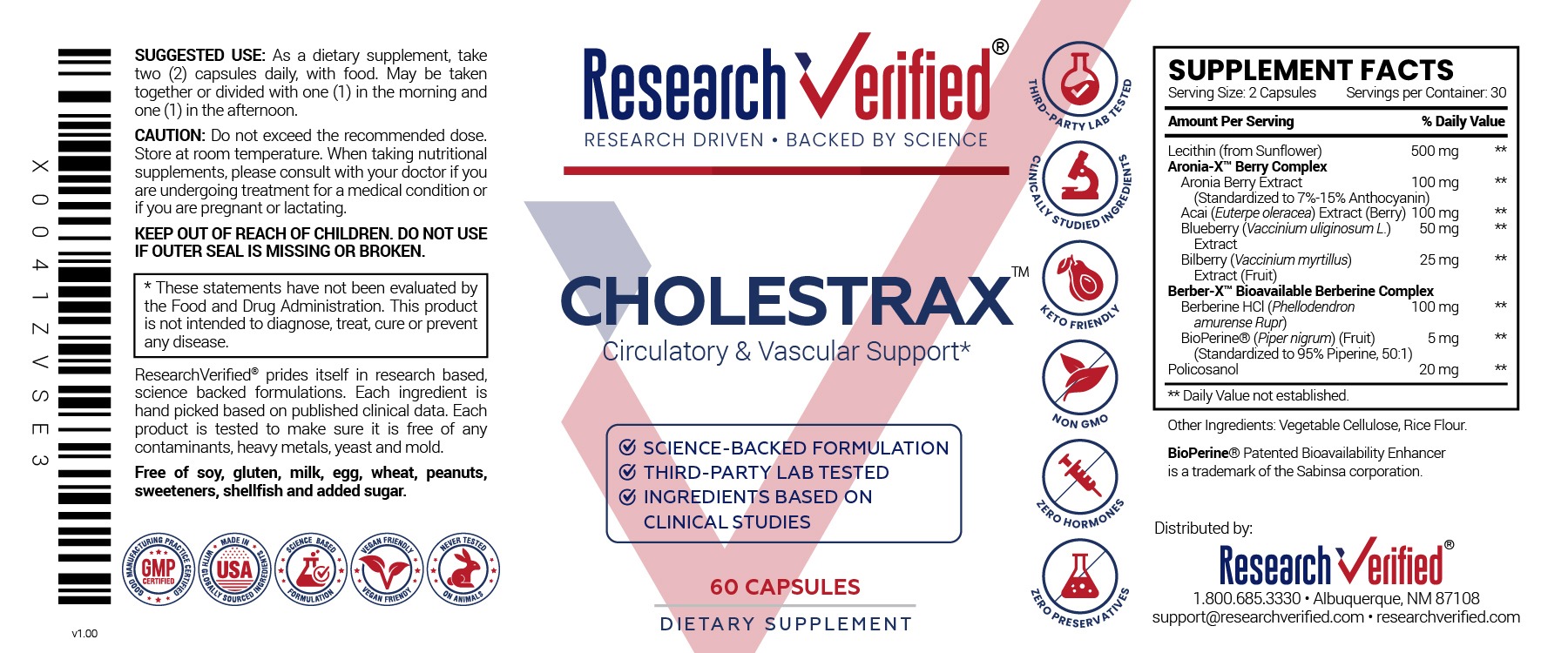 We pride ourselves on the purity of our ingredients, effectiveness, service, and customer satisfaction. All of the ingredients and concentrations in our Cholestrax™ formula are extensively researched and scientifically backed to ensure that you receive the safest and most effective product. Our customers are highly satisfied with the Research Verified Cholestrax™ product, and here’s why: 1. It features Aronia-X™ Berry Complex, rich in plant sterols and stanols, to help block cholesterol absorption. 2. It contains Berber-X™, a bioavailable Berberine complex enhanced with BioPerine® for better absorption and faster results. 3. The formula includes clinically studied doses of Lecithin and Policosanol to support LDL reduction and HDL synthesis. 4. The ingredients are high-quality, with no junk. 5. Our supplements are manufactured in an FDA-registered lab with cGMP certification. 6. Research Verified® complies with the standards for quality and purity outlined by the U.S Pharmacopeia. 7. Customers have a 365-day money-back guarantee, 100% risk-free!
