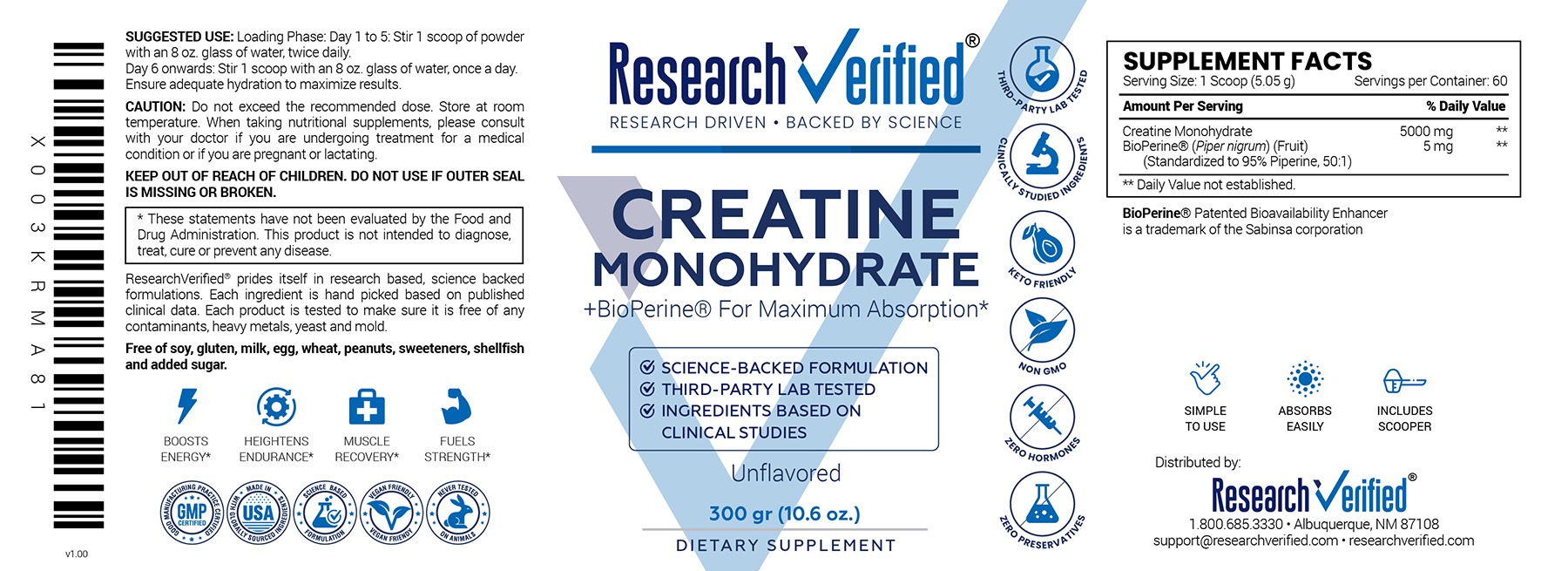 In summary, Research Verified® Creatine Monohydrate meets all of the criteria listed above. It's the highest quality Creatine supplement on the market. Here's a list of some of the criteria that it meets.