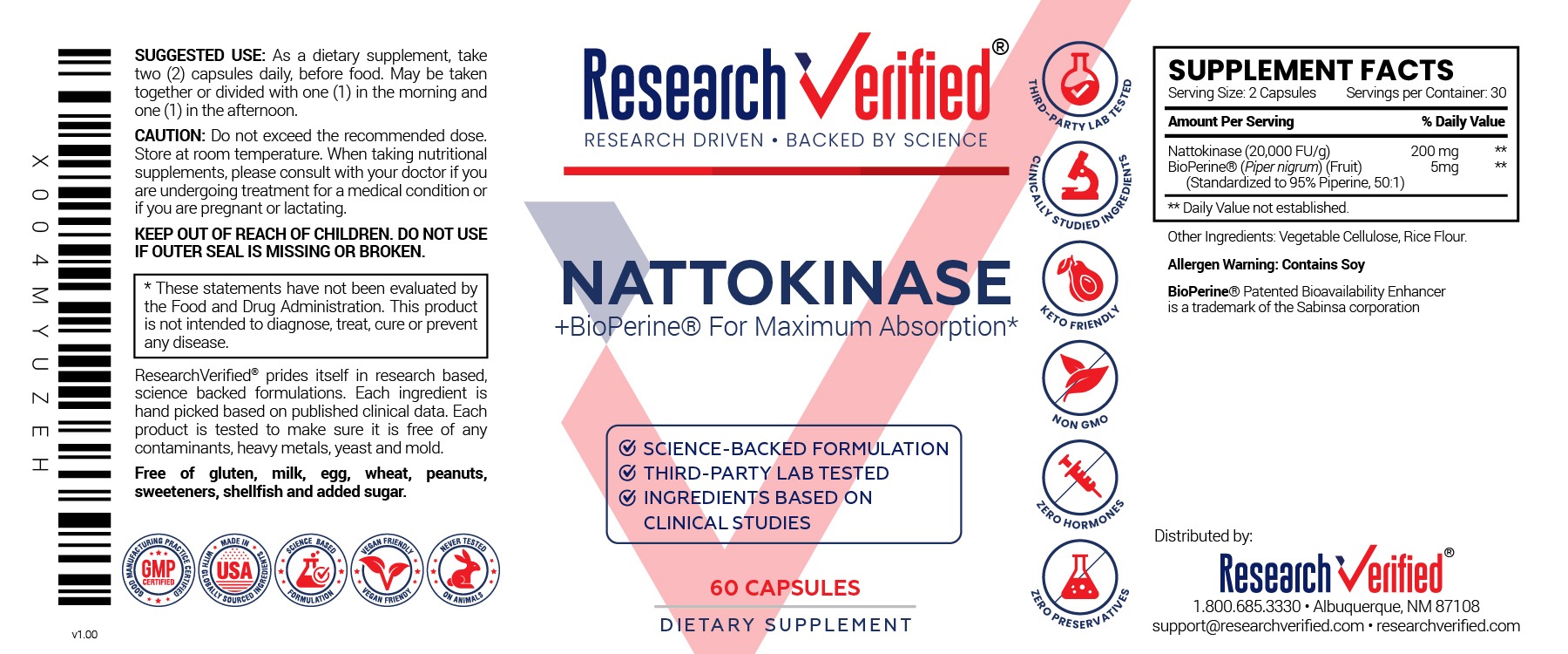 We pride ourselves on the purity of our ingredients, product effectiveness, outstanding service, and customer satisfaction. All of the ingredients and concentrations in our formula are extensively researched and scientifically backed to ensure that you receive the safest, most effective product possible. Our customers love Research Verified® Nattokinase, and here’s why: 1. It contains a clinically studied, potent dosage of 4000 FU per day that is split between 2 capsules to support absorption and maintain steady levels. 2. It contains BioPerine®, the patented black pepper extract, to boost nutrient absorption for faster, more effective results. 3. Our supplements are manufactured in an FDA-registered lab with cGMP certification. 4. Research Verified® complies with the standards for quality and purity outlined by the U.S. Pharmacopeia. 5. Customers have a 365-day, money-back satisfaction guarantee!