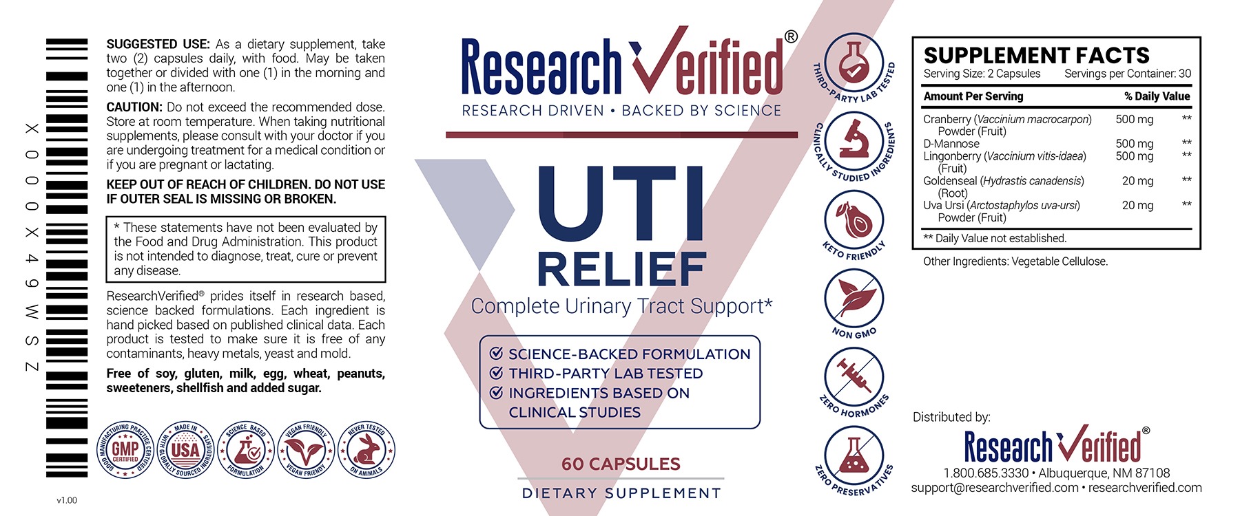 At Research Verified, we pride ourselves on ingredient purity, product effectiveness, great service, and customer satisfaction. There are plenty of urinary tract supplements out there, but few offer the level of strength, transparency, and balance we were looking for. That’s why we created UTI Relief – to deliver clean, targeted support that actually makes a difference. Here’s what sets us apart: 1. Blending Science With Nature: Our formula combines well-established natural ingredients like Cranberry, D-Mannose, Lingonberry, Goldenseal, and Uva Ursi with science-backed doses – all carefully chosen to help flush unwanted bacteria and support daily urinary health. 2. Providing Top-Notch Quality: Every bottle is made in an FDA-registered, cGMP-certified lab and meets strict U.S. Pharmacopeia standards for purity, potency, and quality. 3. While many brands rely on a sprinkle of cranberry, we use a full 500mg dose – plus Lingonberry, which is rarely included but clinically supported. We also include BioPerine® to enhance absorption of every ingredient for faster, more reliable results. 4. Putting Our Money Where Our Mouth Is: We’re so confident in the quality of our product that we offer a 365-day money-back guarantee. Try it risk-free – if you’re not satisfied, return it. No questions asked.